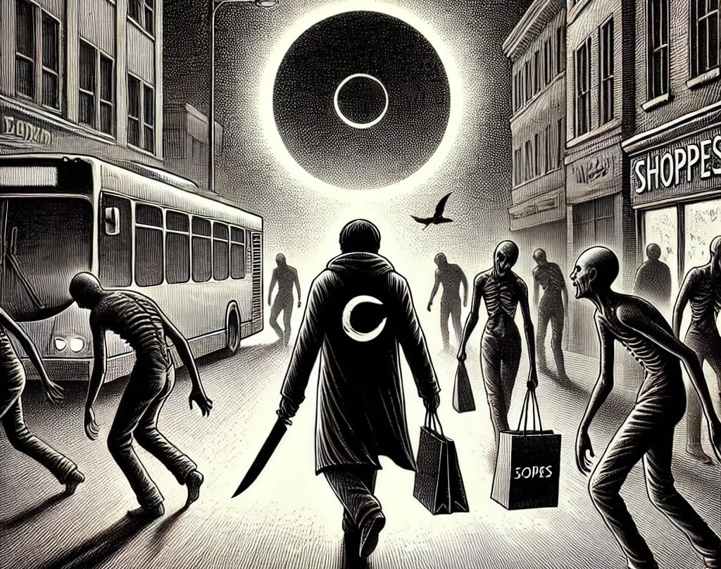 ¡Ra-ta-tá!; ¡ra-ta-tá! Hago una batida sobre la gente que espera cola para entrar en una tienda. ¿En serio?, ¿qué pueden ofrecerle al mundo unos zombis que esperan horas para comprar mierdas que no necesitan?, nada bueno, eso es así. Media hora de cola para comprar bragas a dos euros, si tan poco valor le dan al tiempo, entonces es que no merecen tenerlo. Me quedo con sus vidas, «clinc, clinc, clinc».
